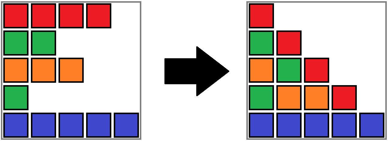 考虑按列从左往右考虑这个问题,会发现从第二列开始,每一列都是上一列去掉某一个块,假设当前是第$i$列,那么被去掉的那个块实际上就是数值为$i-1$的那一行的最后一个方块,因此我们可以把重力排序法的问题转换成这个模型,也就是按顺序移除方块的模型。